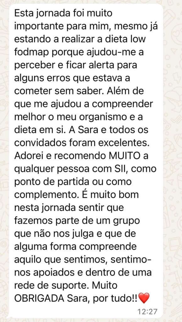 Pedimos que vejas os testemunhos dos nossos clientes. Todos os testemunhos são reais, de pessoas reais que já acompanham a Nutrisciente ®. Este programa de acompanhamento em grupo não substitui o acompanhamento nutricional individualizado, pelo que se pretendes uma consulta de nutrição sugerimos que agendes aqui a tua (Linkar: https://nutrisciente.com/servicos/ ). O programa da Jornada do Intestino Irritado foi desenvolvido pela Drª Sara Barreirinhas, Nutricionista (2098N), investigadora portuguesa para os FODMAP e Certificada pela Universidade de Monash para a dieta baixa em FODMAP, pelo que constitui uma mais-valia para estes utentes. Se já tentaste de tudo e estás a ler isto, então é porque estás no sítio certo para ti!